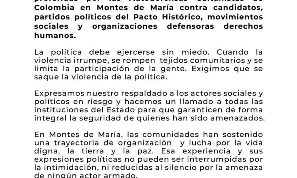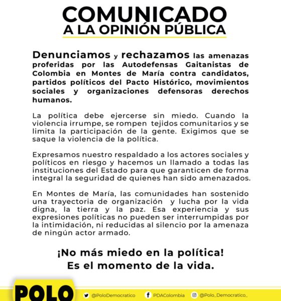 Desde el Polo Democrático Alternativo denunciamos y rechazamos las amenazas proferidas por las Autodefensas Gaitanistas de Colombia en Montes de...
